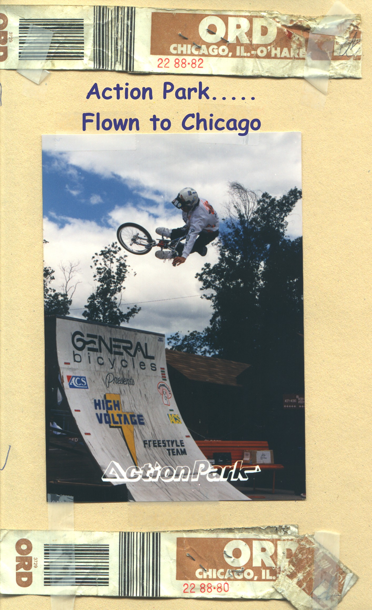 About two months after this photo, Harry Myers called and asked me if I wanted to be flown to Chicago to meet up with the General team and take over as their manager. Yes. I’m a little nostalgic so I kept the luggage tags to get my stuff on the plane. Great times in the summer of ’88. For more BMX craziness pick up my book, “The Average BMXer” available on Kindle, and on Lulu.com in e-pub and Hardcover form.