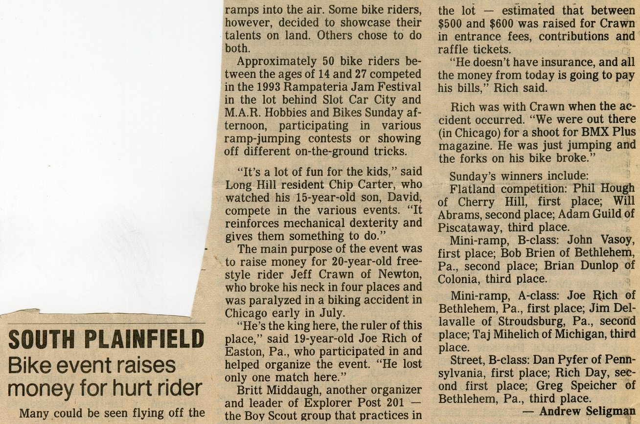 This throwback sucks. It sucks because it is a newspaper article for the fundraiser we did for Jeff “Crawndor” Crawn after his accident in Chicago. Jim Dellavalle came up with the idea and asked if we could hold it there. I was more than happy to. A down time in the NJ scene… For more of this craziness pick up my book, “The Average BMXer” available on Kindle.